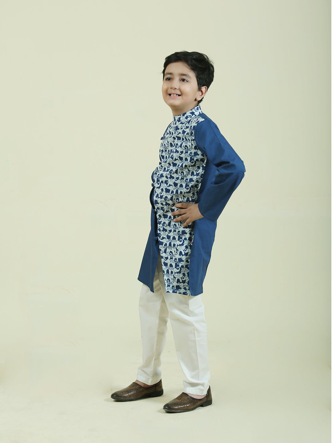 This dual color Kurta features a sleek slant design with a Chinese Collar that adds a touch of elegance to any wardrobe. The elephant print ads depth to the fabric and gives a modern touch to a classic style. The Fitted silhouette, Full Sleeves, and Knee Length make it perfect for any occasion. It provides a comfortable yet stylish option for any fashion-forward individual. Perfect for any traditional Indian festivities.Father Son twinning options available.