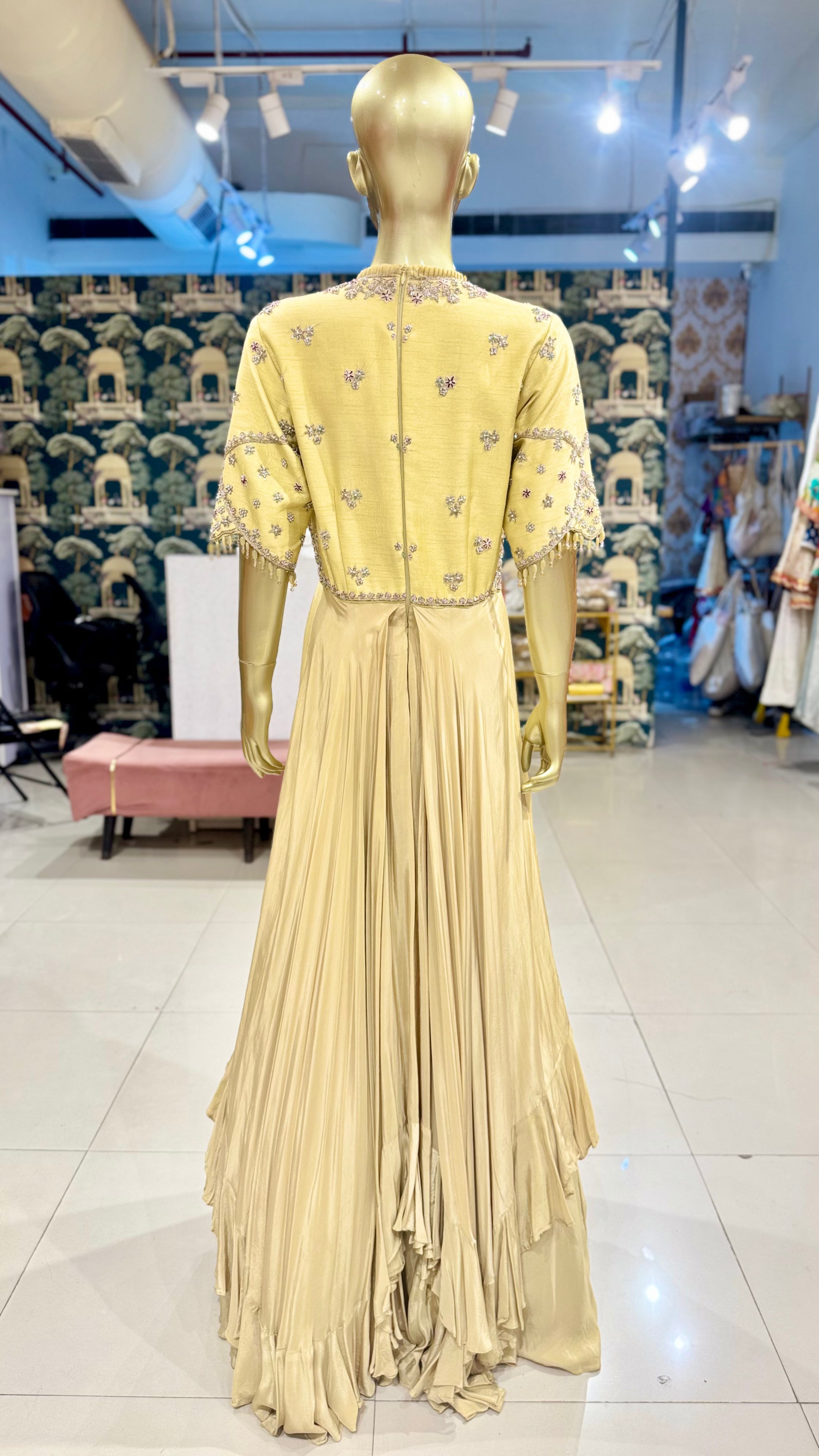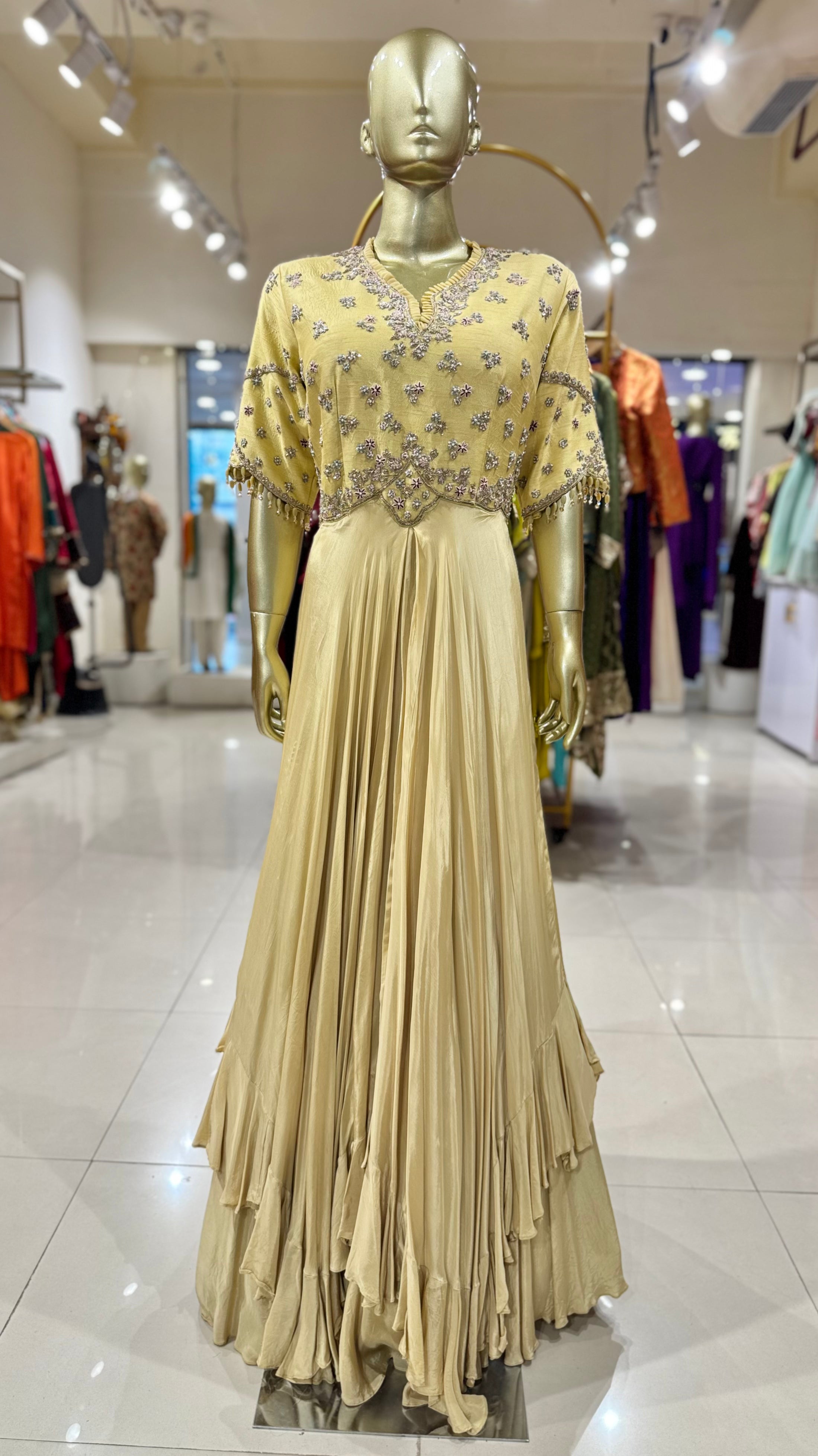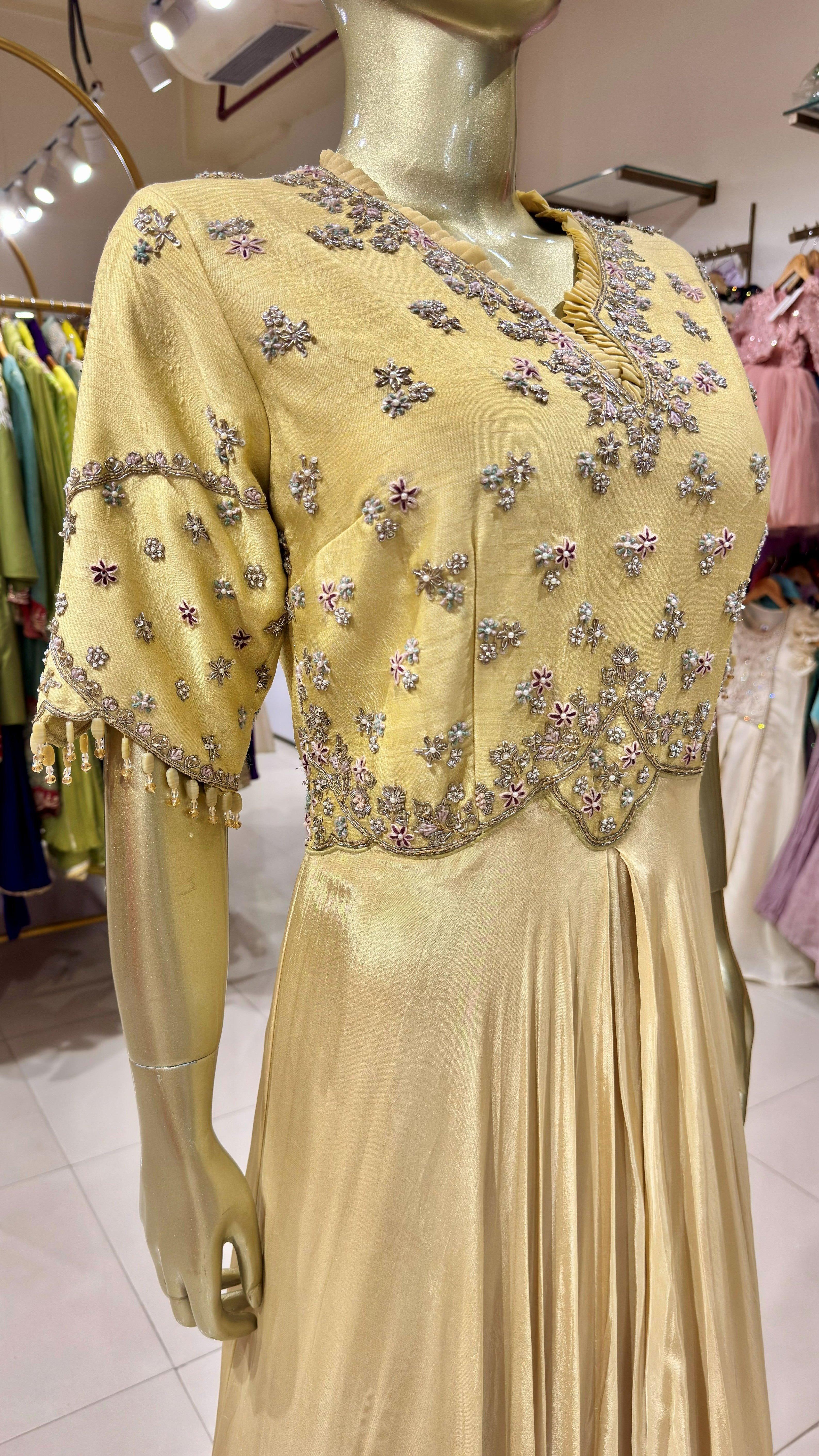 This Light Yellow gown set is crafted in premium soft crepe satin fabric that drapes beautifully on the body, offering effortless comfort and grace. Featuring a rich flare with beautiful silhouette, the yoke is adorned with intricate hand embroidery and delicate embellishments. This ensemble is perfect for weddings, festive occasions, and family celebrations.