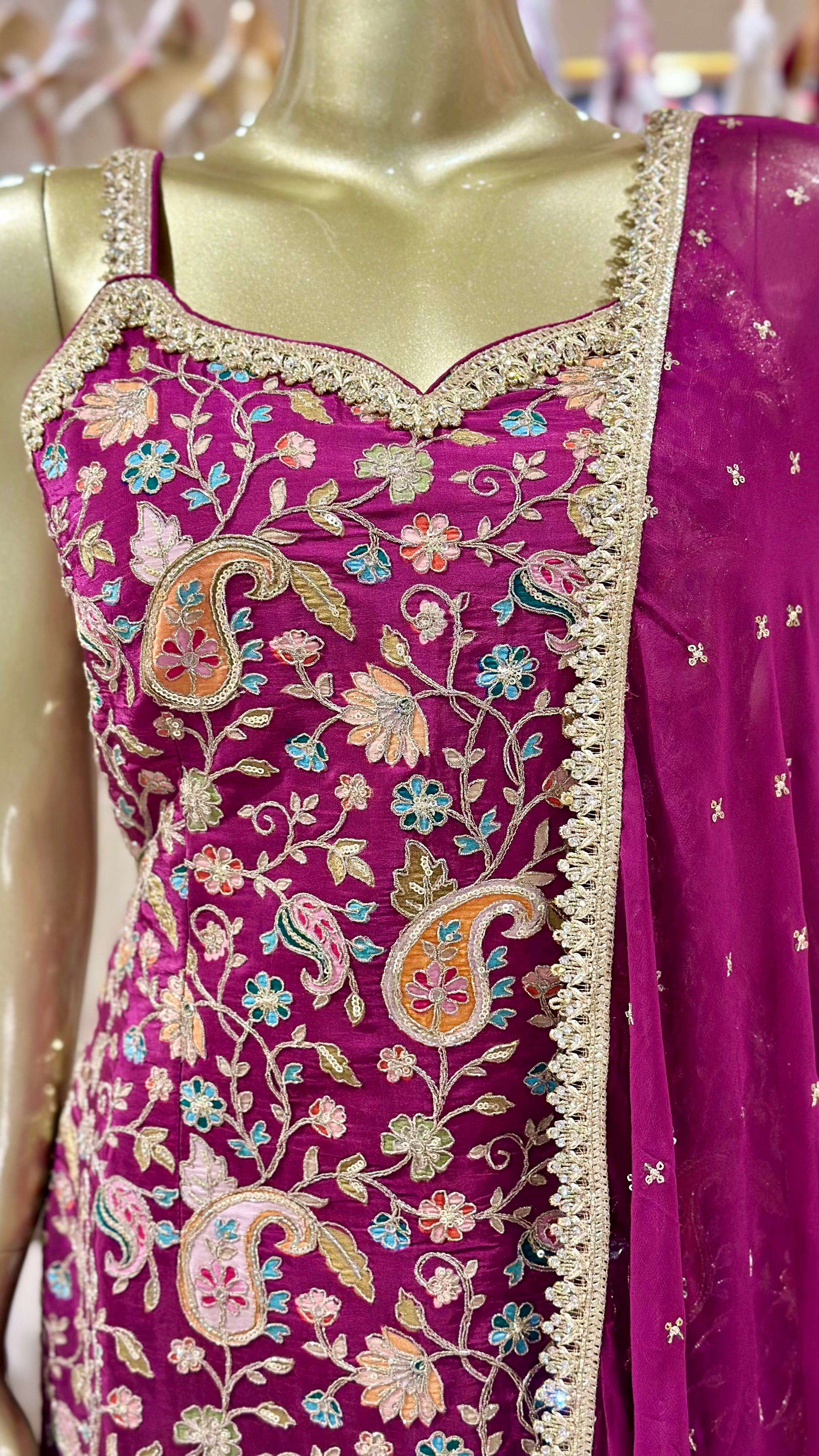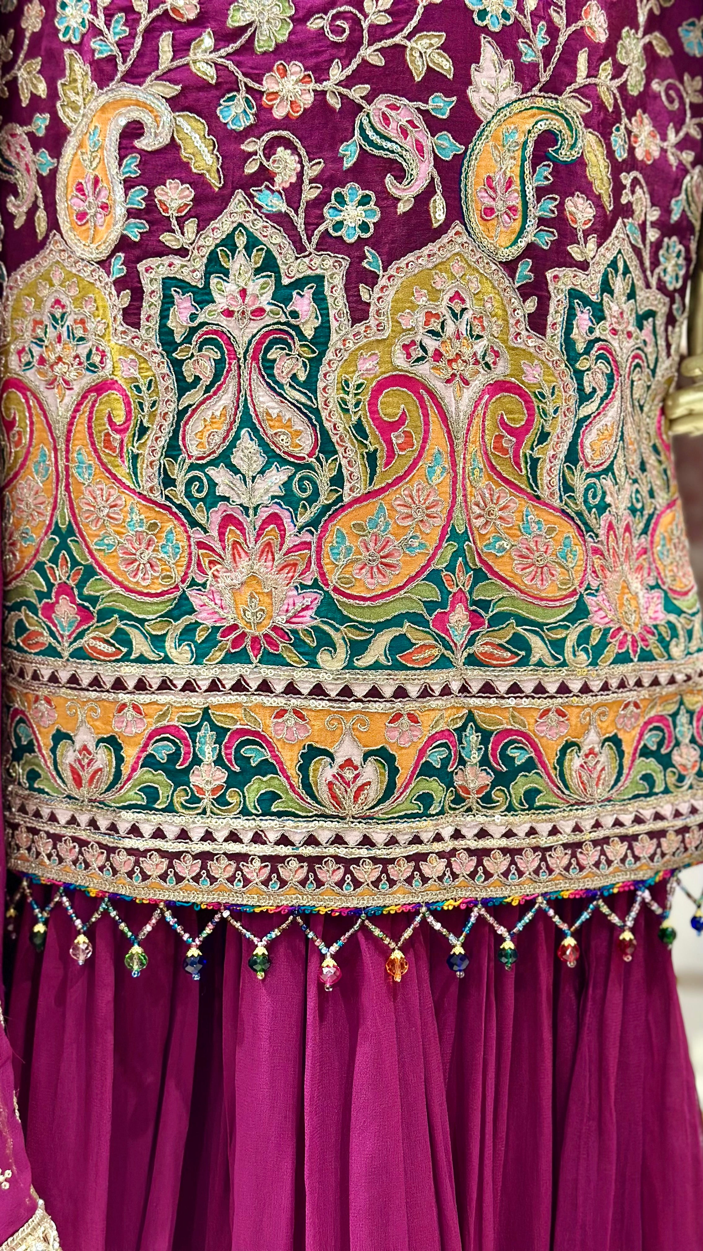 Step into celebrations with this stunning purple sharara set, featuring intricate work all over the kurta for a rich and elegant look. Paired with a flowy georgette sharara, this outfit is the perfect choice for the festive season, making you shine with effortless grace at every celebration. Available now at Folk Culture Clothing