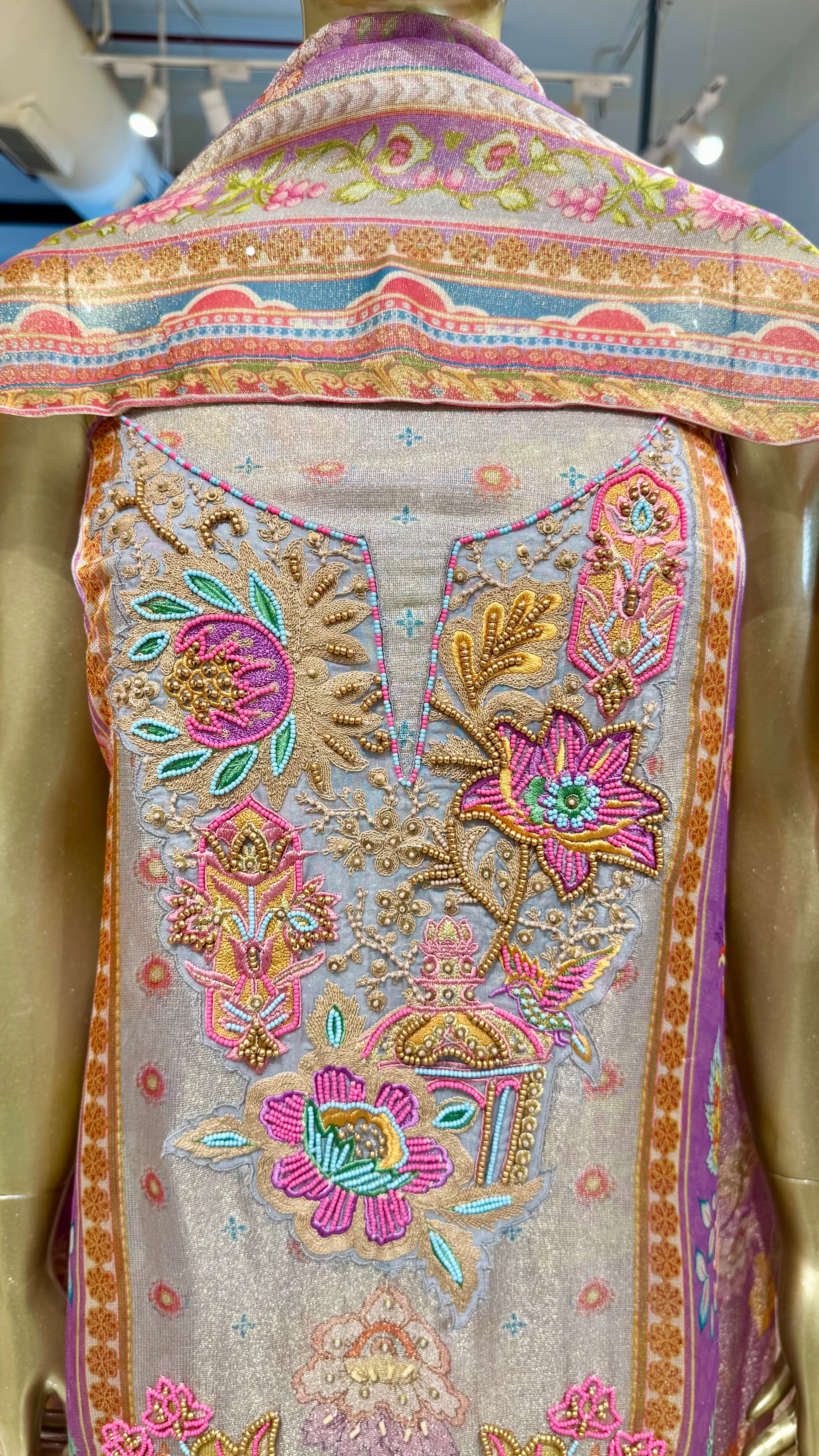 Elevate your festive wardrobe with this sophisticated lavender shimmer linen suit fabric set, designed for timeless elegance. Featuring a graceful digital print throughout, the kurta fabric is beautifully enhanced with intricate hand embroidery and delicate bead work around the round neckline.