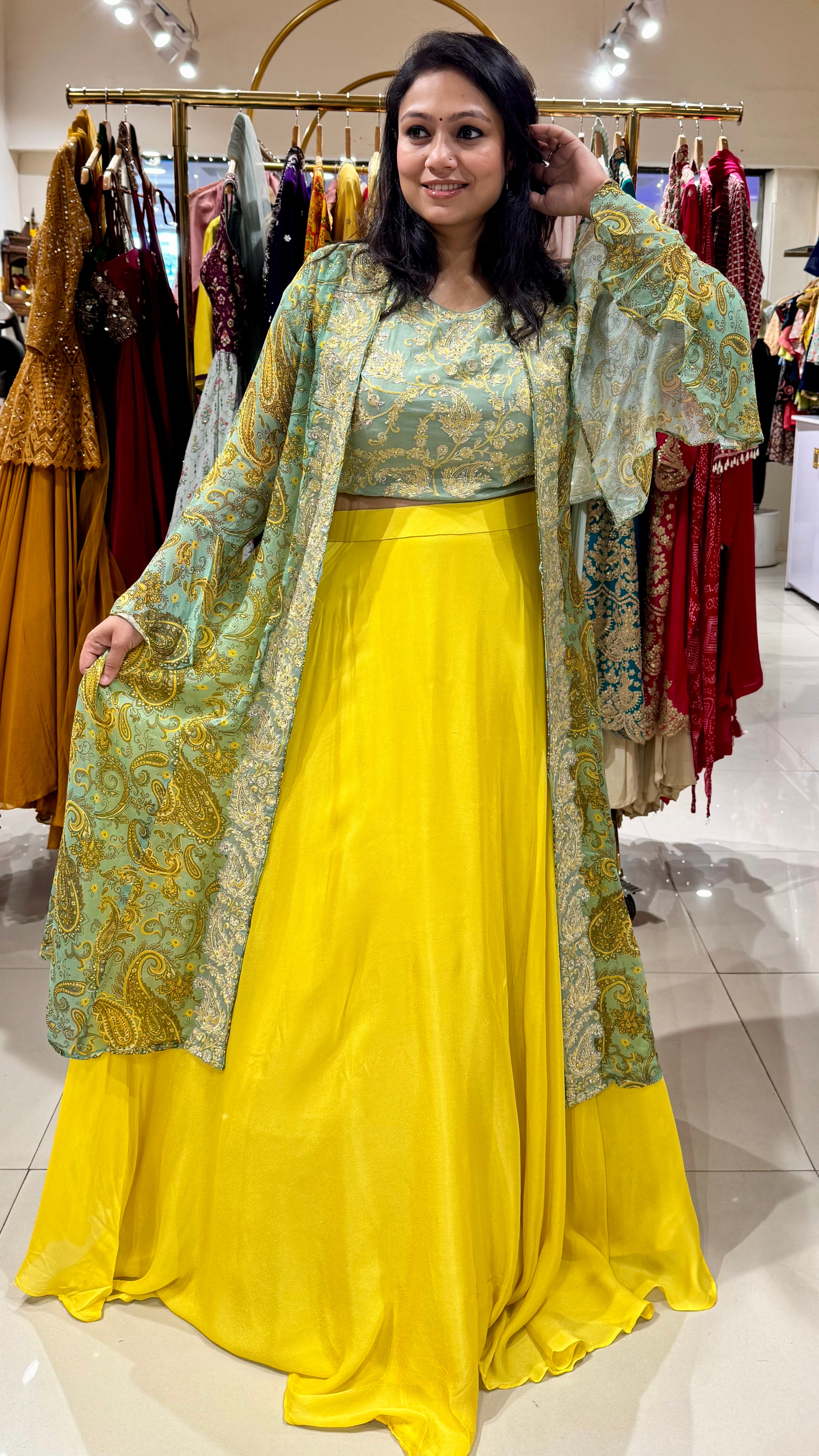 Yellow Skirt, Cape & Blouse Set – Perfect for Haldi & Mehendi Celebrations