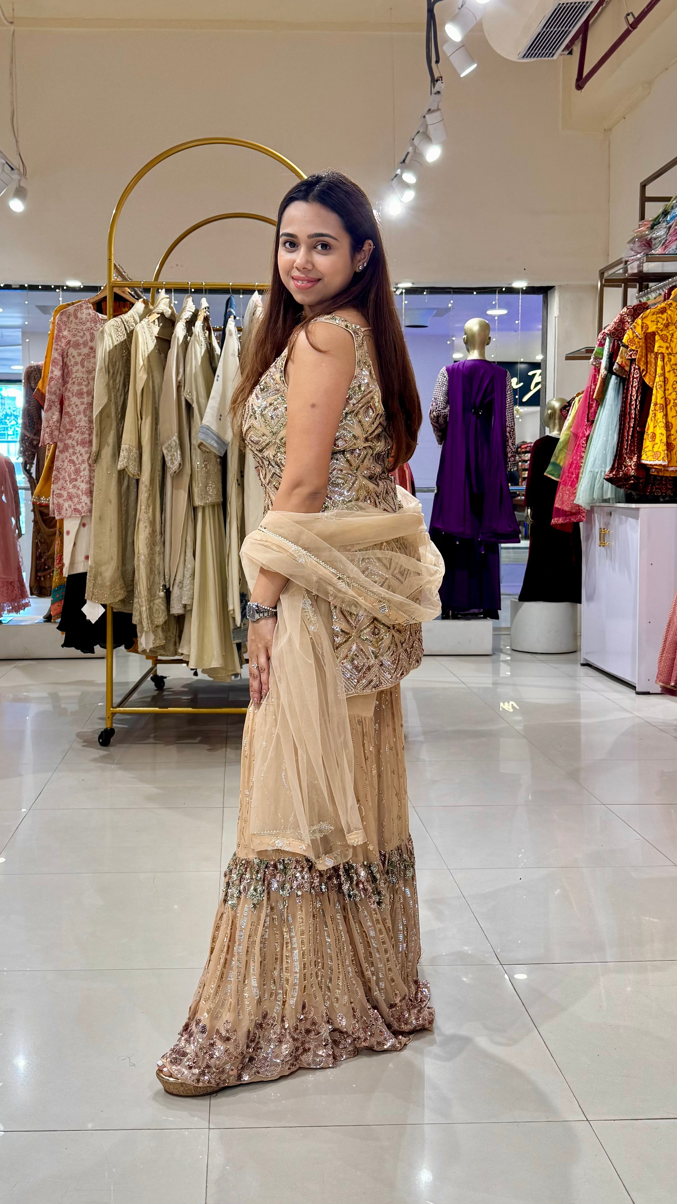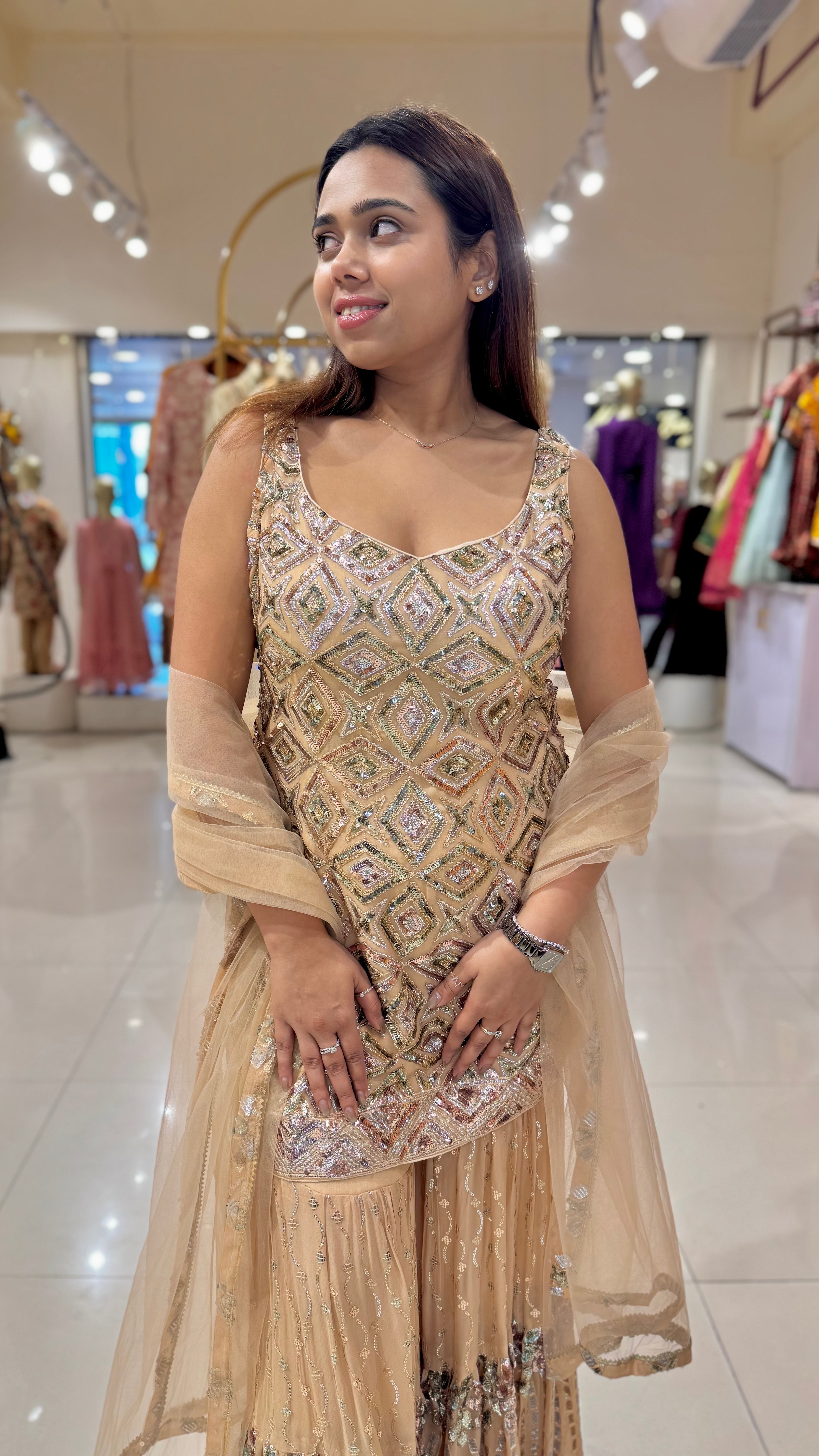 The strappy kurta adds a modern touch, perfectly balanced by the flared sharara for graceful movement. Paired with a delicate net dupatta, this outfit is ideal for weddings, festive celebrations, sangeet nights, and special occasions where you want to shine with confidence.